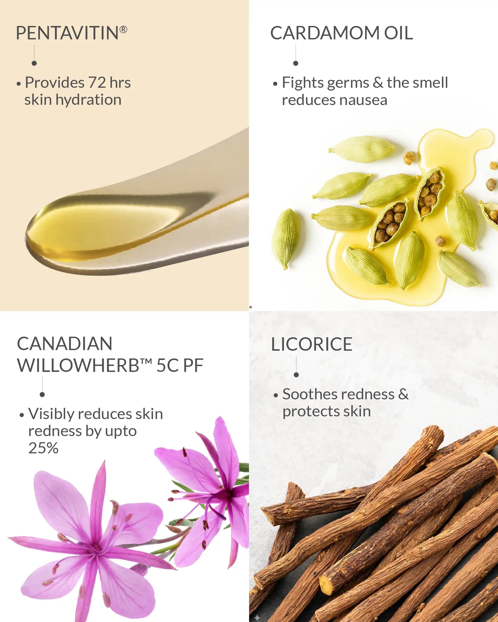 Moisturising Spray Lotion: Aqua, Glycerin, Caprylic/Capric Triglyceride, Gluconolactone (&) Sodium Benzoate, Saccharide Isomerate (&) Aqua (&) Citric Acid (&) Sodium Citrate, Trehalose, Glycerin (&) Water (&) Epilobium Angustifolium (Canadian Willowherb) Wholeplant Extract, Xanthan Gum, Hydrolyzed Milk Protein, Sodium Hyaluronate HMW, Sodium Hydroxide, Elettaria Cardamomum (Cardamom) Seed Oil, Sodium Gluconate, Dipotassium Glycyrrhizate, Zingiber Officinale (Ginger) Root Oil, Camellia Sinensis (Tea) Aqueous Extract.