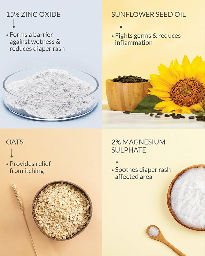 Aqua, Zinc Oxide, Caprylic/Capric Triglyceride, Glycerin, Polyglyceryl Polyricinoleate, Helianthus Annuus (Sunflower) Seed Oil, Magnesium Sulfate, Avena Sativa (Oat) Kernel Flour, Gluconolactone (&) Sodium Benzoate, Manihot Esculenta (Tapioca Starch), Sodium Chloride, Xanthan Gum, Hydrolyzed Milk Protein, Sodium Gluconate.