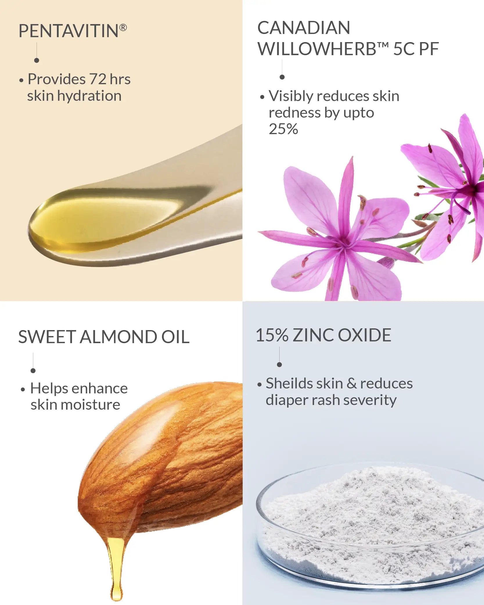 Unscented Diaper Rash Cream: Zinc Oxide, Aqua, Caprylic/Capric Triglyceride, Glycerin, Polyglyceryl Polyricinoleate, Manihot Esculenta (Tapioca Starch), Helianthus Annuus (Sunflower) Seed Oil, Magnesium Sulphate, Avena Sativa (Oat) Kernel Flour, Gluconolactone (&) Sodium Benzoate, Sodium Chloride, Hydrolyzed Milk Protein, Sodium Gluconate.
