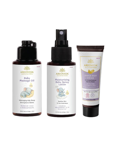 Baby Massage Oil: Sesamum Indicum (Sesame) Seed Oil, Prunus Amygdalus Dulcis (Sweet Almond) Seed Oil, Brassica Campestris (Rapeseed) Seed Oil, Ghee, Cannabis Sativa (Hemp) Seed Oil, Vitis Vinifera (Grape) Seed Oil, Tocotrienol (&) Tocopherol (&) Medium Chain Triglycerides (&) Monoglycerides (&) Diglycerides (&) Squalene (&) Sterol, Crocus Sativus (Saffron) Flower Extract, Anethum Graveolens (Dill) Seed Extract, Rubia Cordifolia (Manjistha) Root Extract, Sida Cordifolia (Bala) Seed Extract, Withania Somnifera (Ashwagandha) Root Extract, Calendula Officinalis (Pot Marigold) Flower Extract.