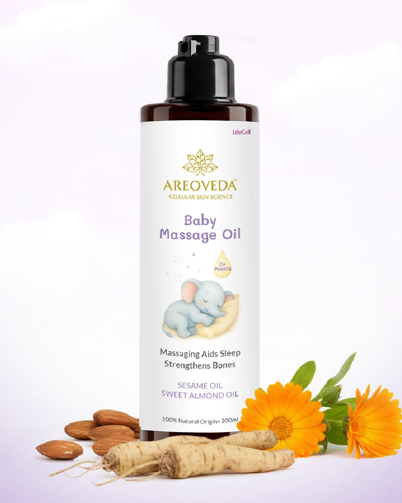 Baby Massage Oil: Sesamum Indicum (Sesame) Seed Oil, Prunus Amygdalus Dulcis (Sweet Almond) Seed Oil, Brassica Campestris (Rapeseed) Seed Oil, Ghee, Cannabis Sativa (Hemp) Seed Oil, Vitis Vinifera (Grape) Seed Oil, Tocotrienol (&) Tocopherol (&) Medium Chain Triglycerides (&) Monoglycerides (&) Diglycerides (&) Squalene (&) Sterol, Crocus Sativus (Saffron) Flower Extract, Anethum Graveolens (Dill) Seed Extract, Rubia Cordifolia (Manjistha) Root Extract, Sida Cordifolia (Bala) Seed Extract, Withania Somnifera (Ashwagandha) Root Extract, Calendula Officinalis (Pot Marigold) Flower Extract.
