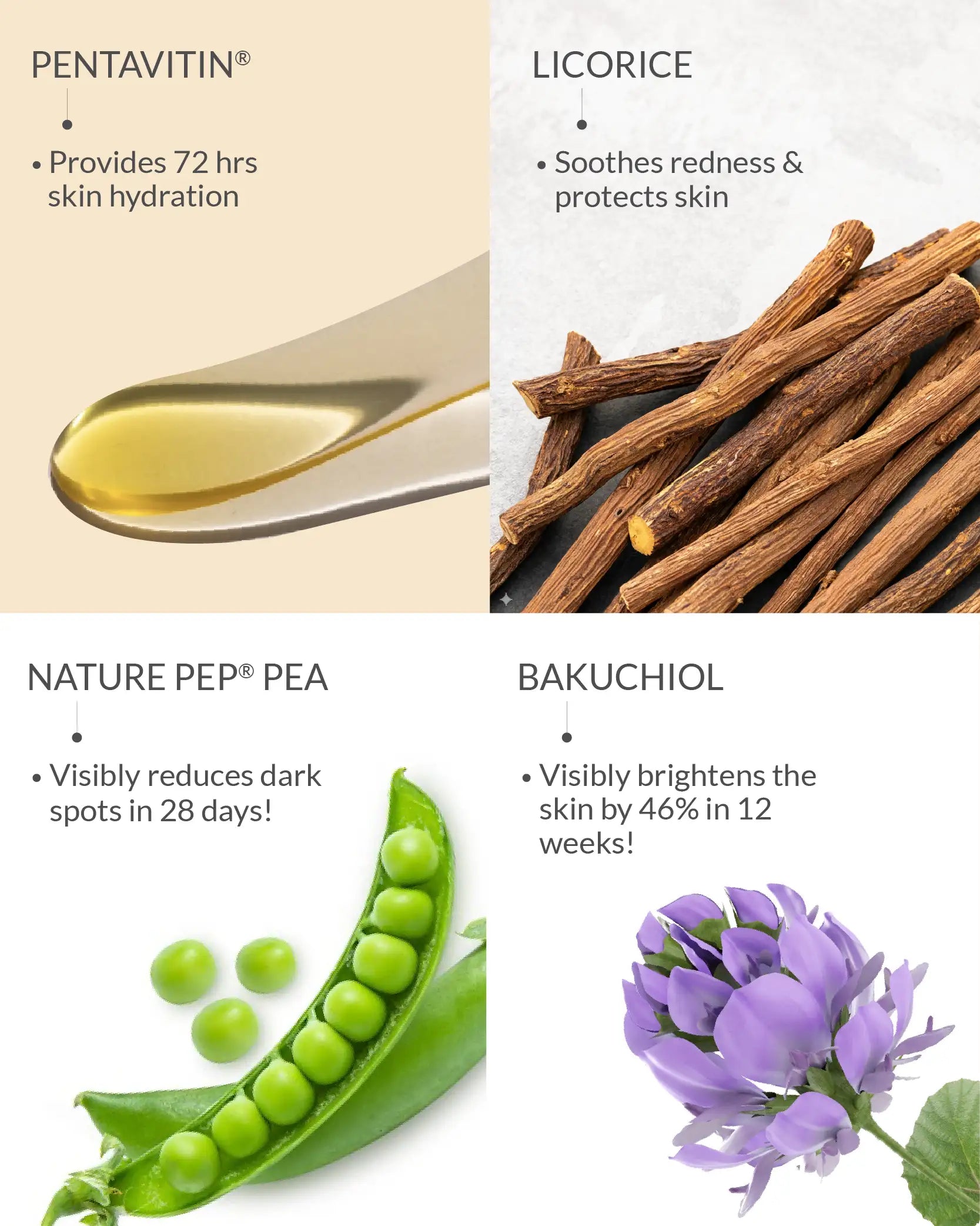 Skin Brightening Serum: Aqua, Glycerin, Saccharide Isomerate (&) Aqua (&) Citric Acid (&) Sodium Citrate, Betaine, Gluconolactone (&) Sodium Benzoate, Pisum Sativum (Pea) Extract, Sodium Hyaluronate LMW, Aloe Barbadensis (Aloe Vera) Leaf Powder, Coffea Arabica Seed Powder, Sodium Hyaluronate HMW, Trehalose, Acacia Senegal Gum (&) Xanthan Gum, Bakuchiol, Coffea Arabica (Arabian Coffee) Seed Oil, Dipotassium Glycyrrhizate, Hydrolyzed Milk Protein, Sodium Hydroxide, Gold Metal Microparticles.
