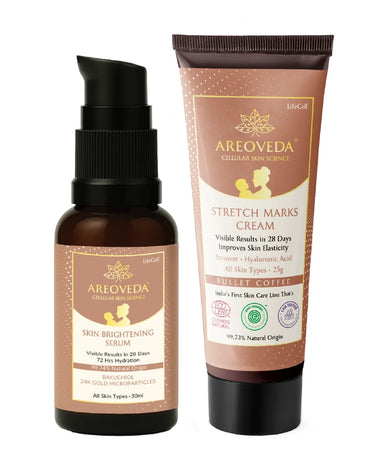 Skin Brightening Serum: Aqua, Glycerin, Saccharide Isomerate (&) Aqua (&) Citric Acid (&) Sodium Citrate, Betaine, Gluconolactone (&) Sodium Benzoate, Pisum Sativum (Pea) Extract, Sodium Hyaluronate LMW, Aloe Barbadensis (Aloe Vera) Leaf Powder, Coffea Arabica Seed Powder, Sodium Hyaluronate HMW, Trehalose, Acacia Senegal Gum (&) Xanthan Gum, Bakuchiol, Coffea Arabica (Arabian Coffee) Seed Oil, Dipotassium Glycyrrhizate, Hydrolyzed Milk Protein, Sodium Hydroxide, Gold Metal Microparticles.